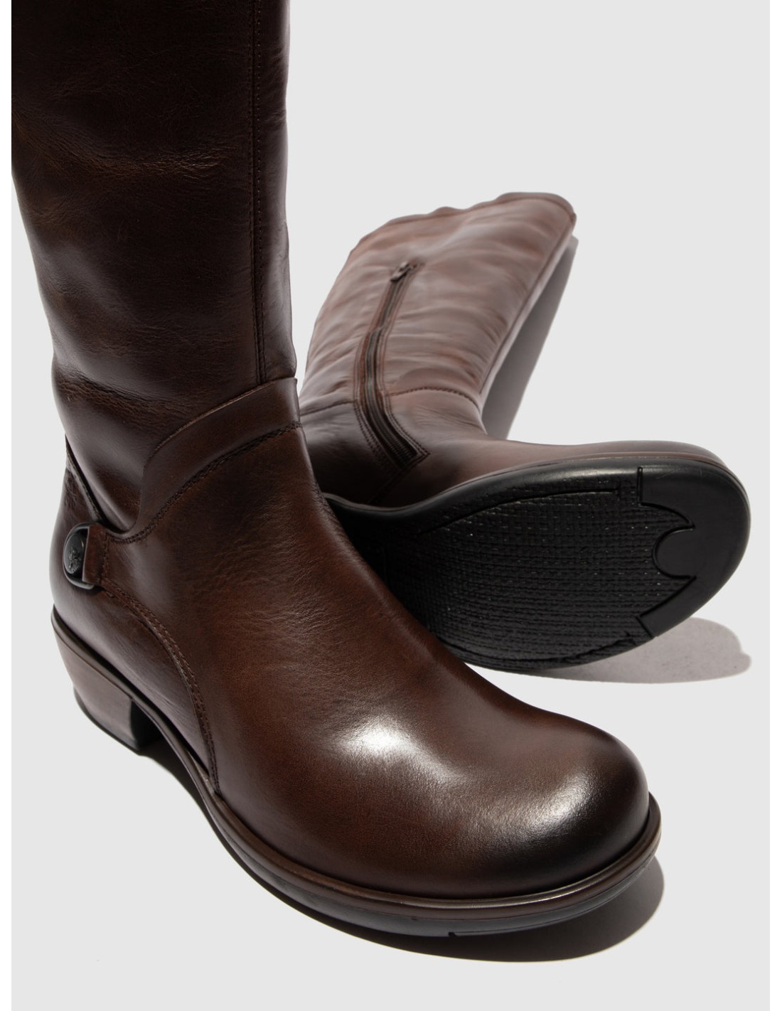 El tacón es anchp y acaba en tapa de plástico. La suela de la bota MELI de Fly London es flexible y duradera y con propiedades antideslizantes.