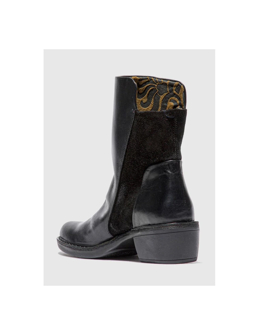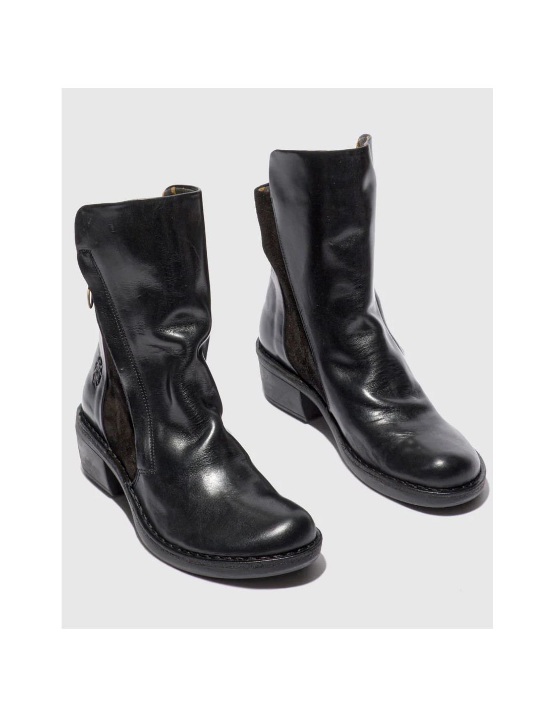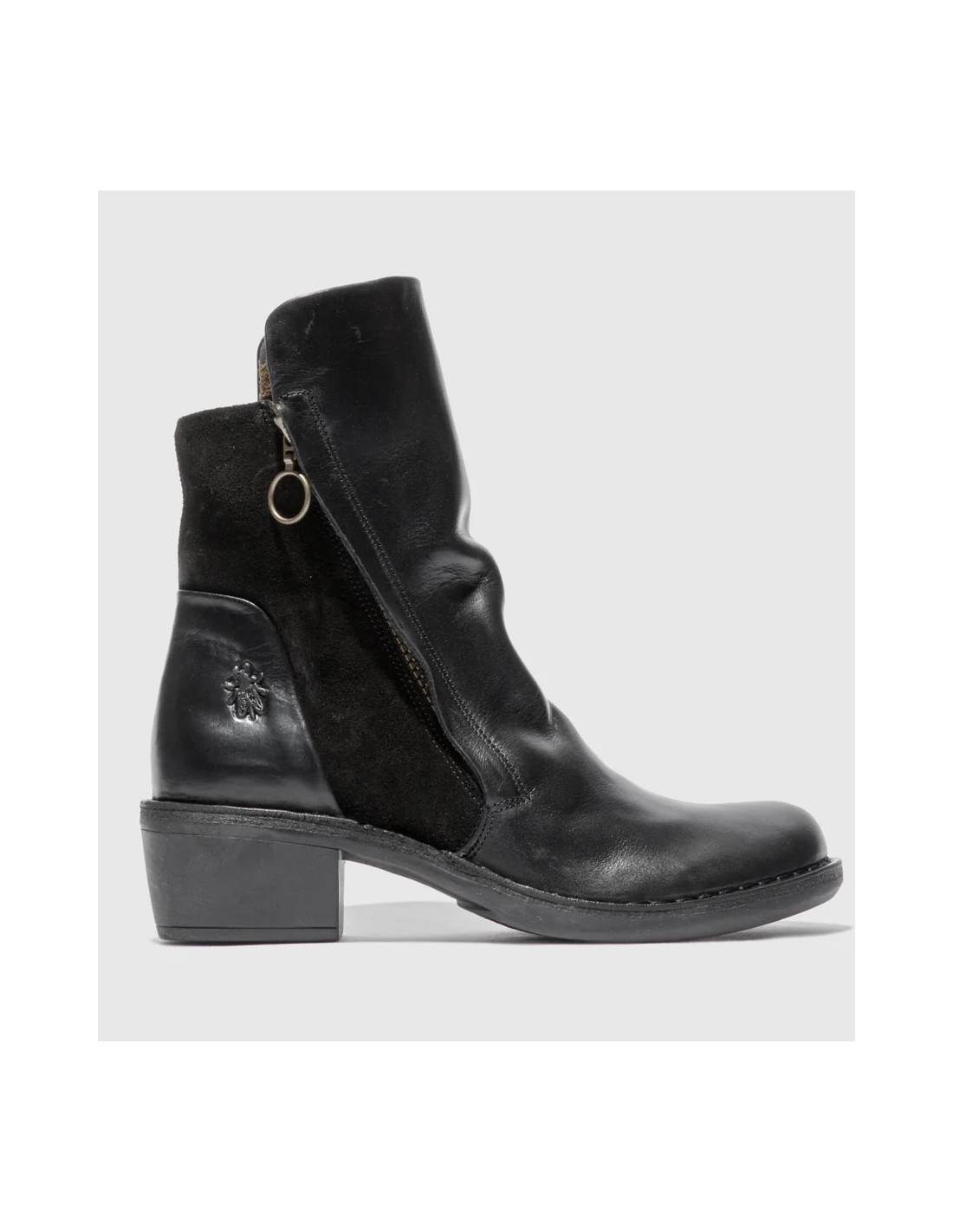 El modelo MELY, es una bota de media caña con tacón bajo de mujer de la línea Mela de fly london, con cierre de cremallera.