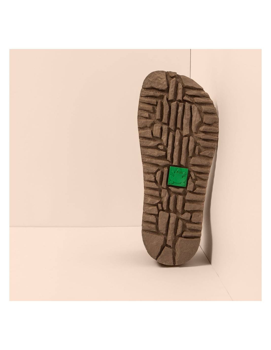 realizada con tejido producido con materiales respetuosos con el medio ambiente, pensando en ti, pero imitando texturas y aspecto de piel, y con suela de goma 100% reciclada.
