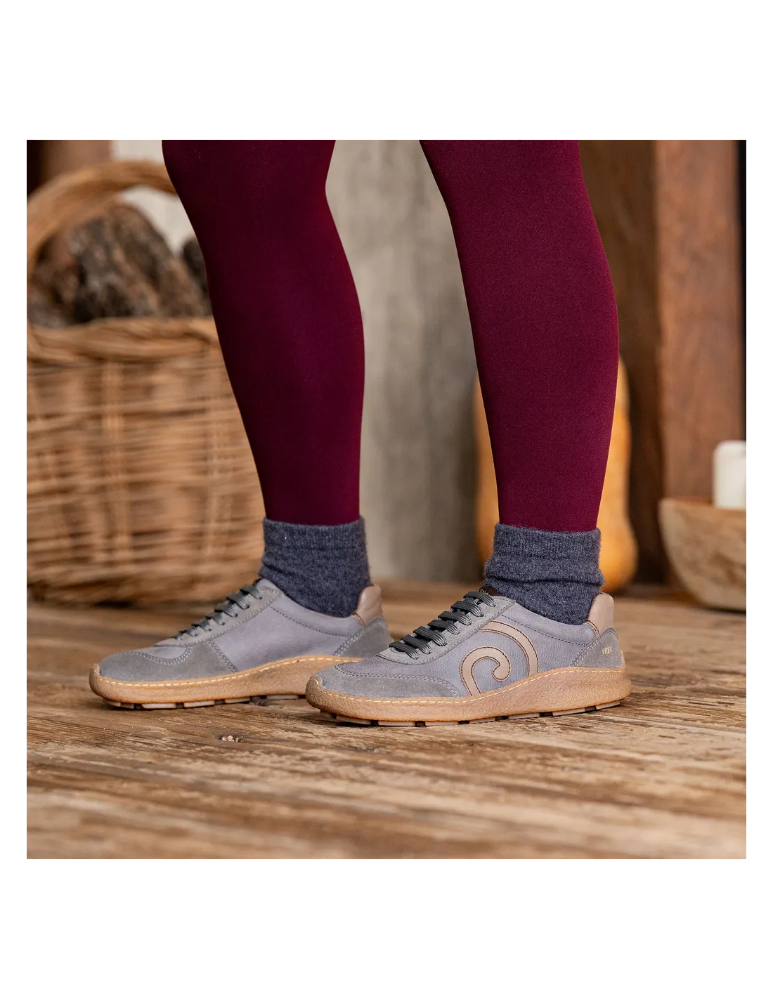 realizada con tejido producido con materiales respetuosos con el medio ambiente, pensando en ti, pero imitando texturas y aspecto de piel, y con suela de goma 100% reciclada.