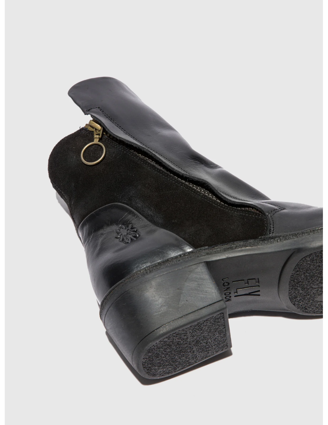 El modelo MELY, es una bota de media caña con tacón bajo de mujer  de la línea Mela de fly london, con cierre de cremallera.