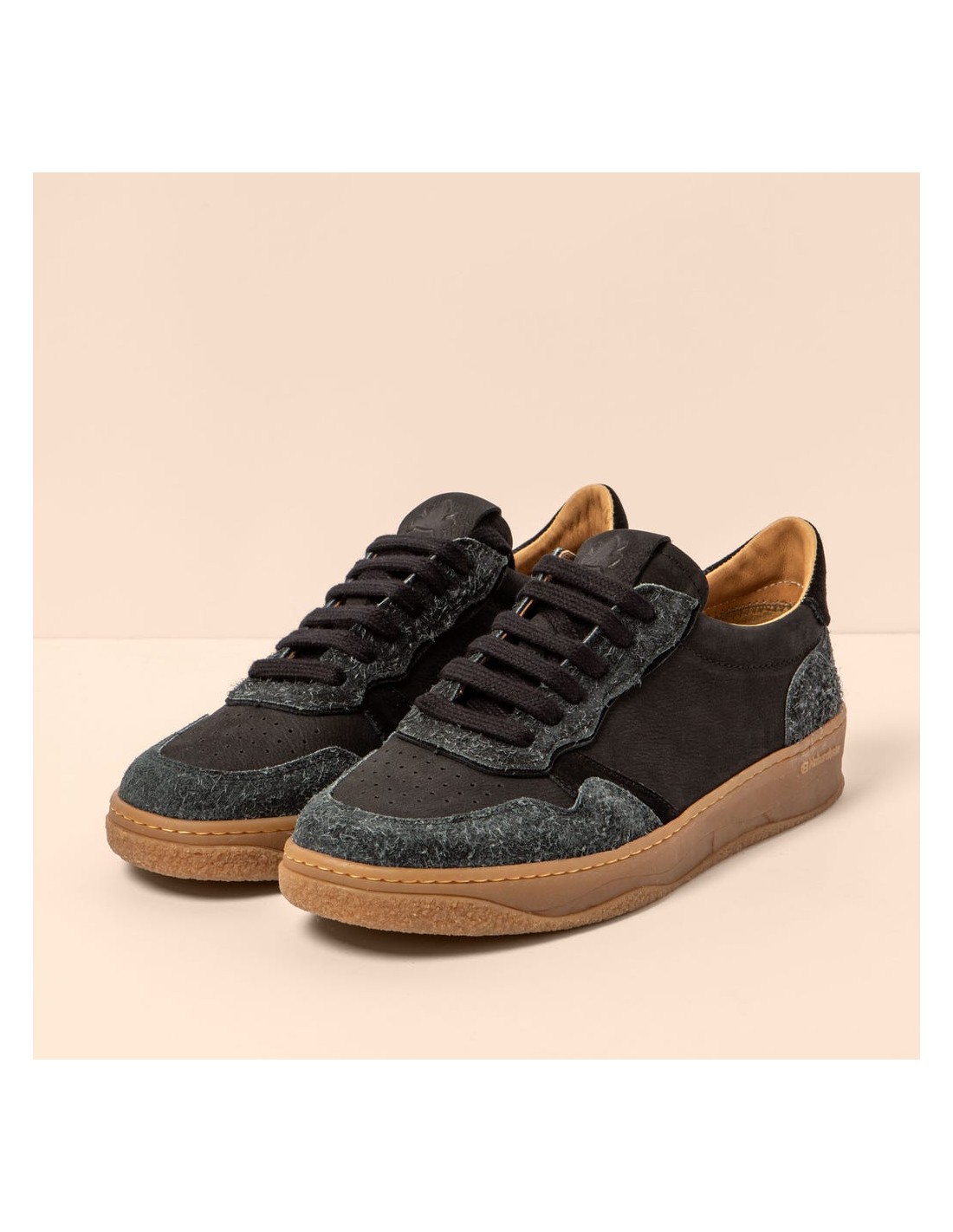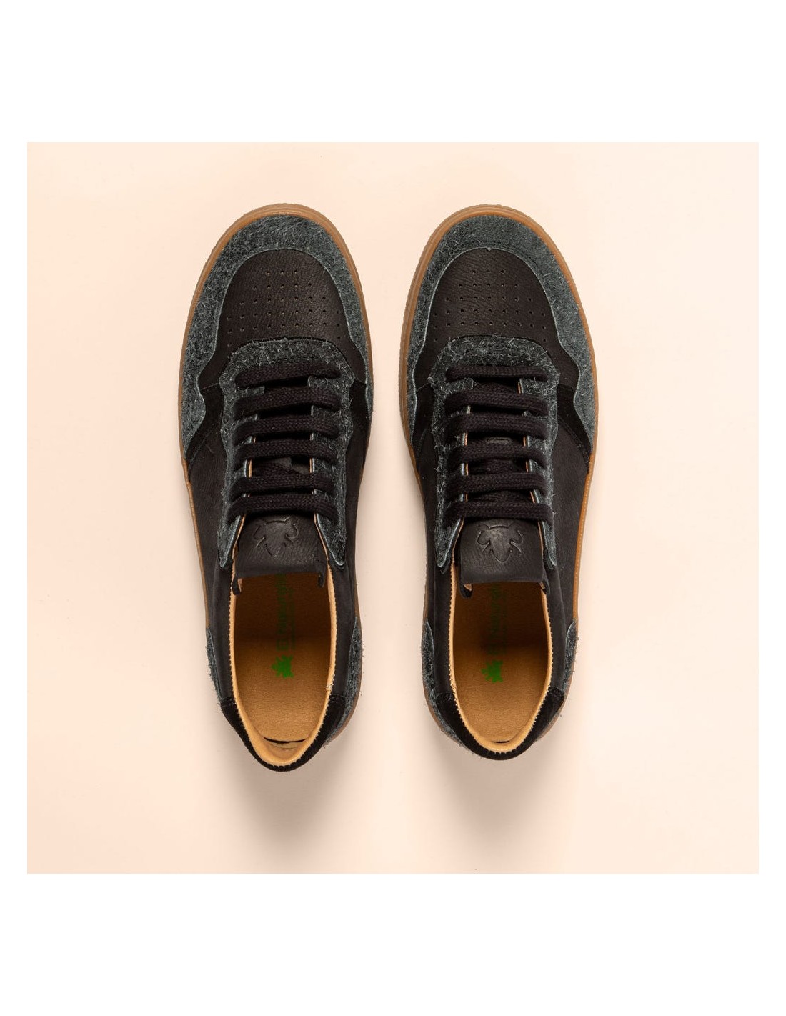 realizada con tejido producido con materiales respetuosos con el medio ambiente, pensando en ti, pero imitando texturas y aspecto de piel, y con suela de goma 100% reciclada.