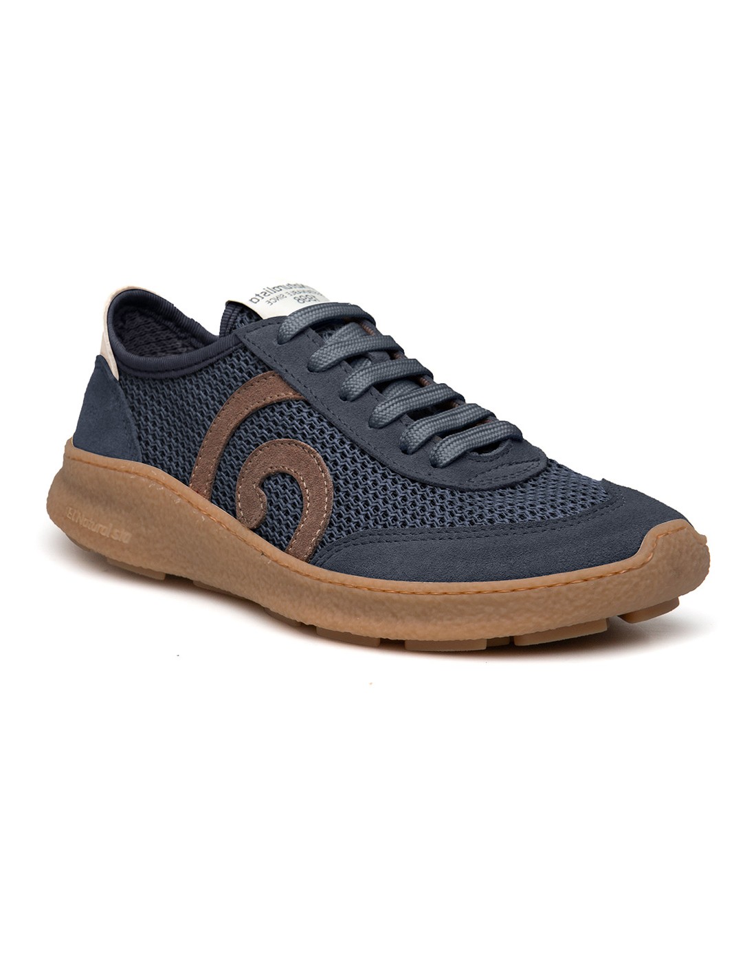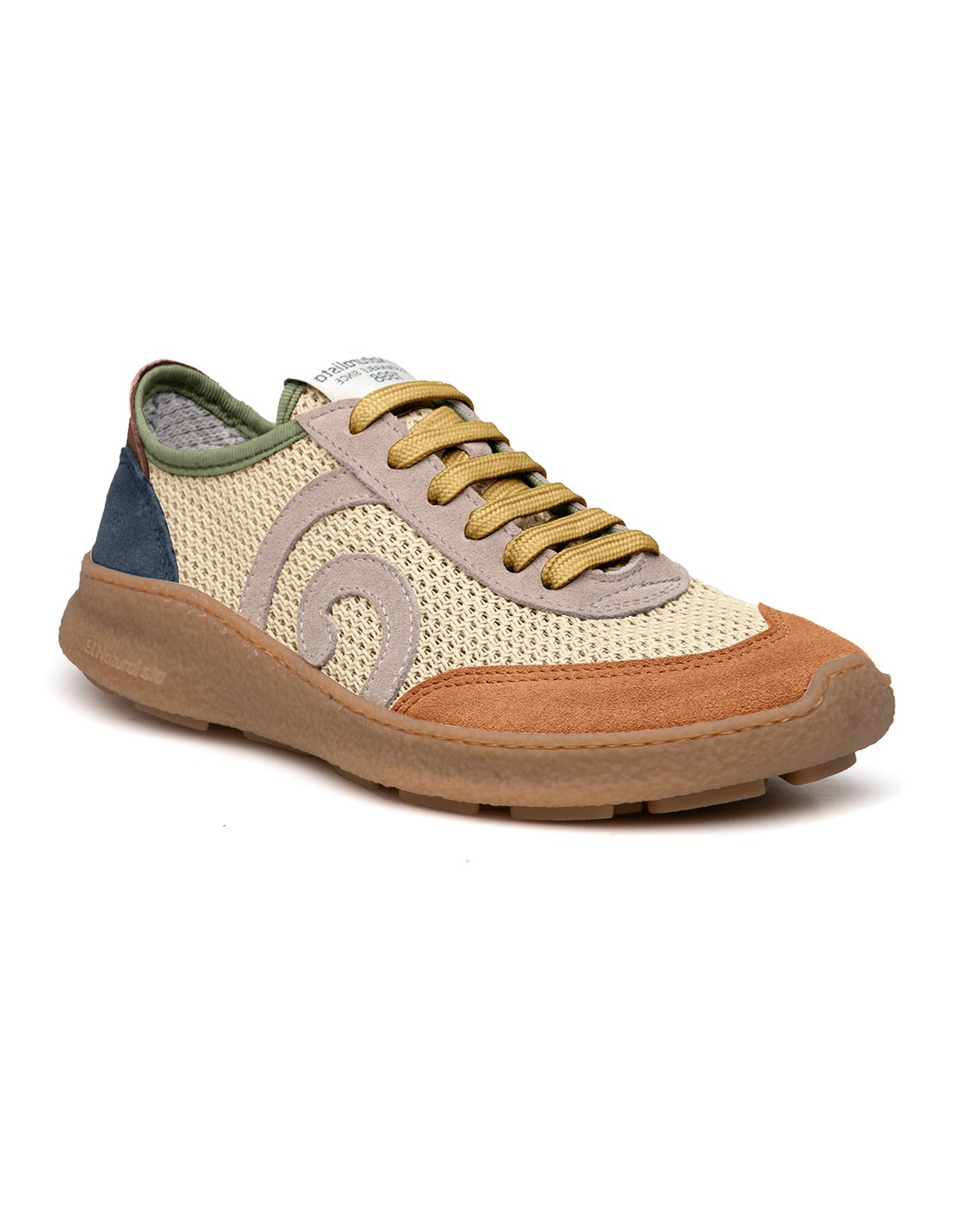 realizada con tejido producido con materiales respetuosos con el medio ambiente, pensando en ti, pero imitando texturas y aspecto de piel, y con suela de goma 100% reciclada.